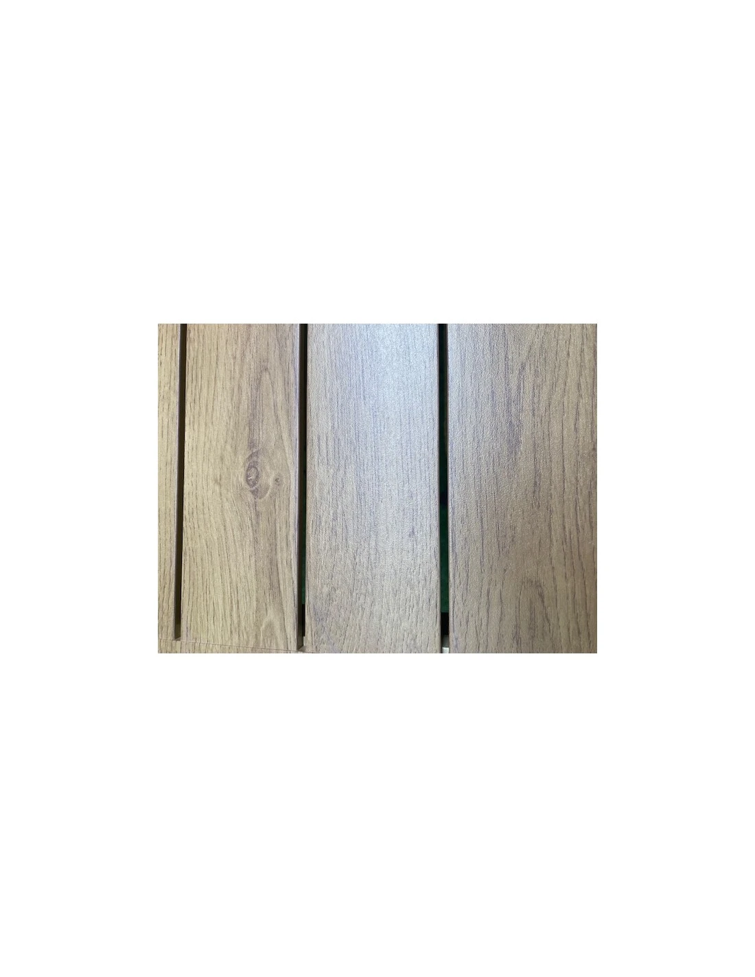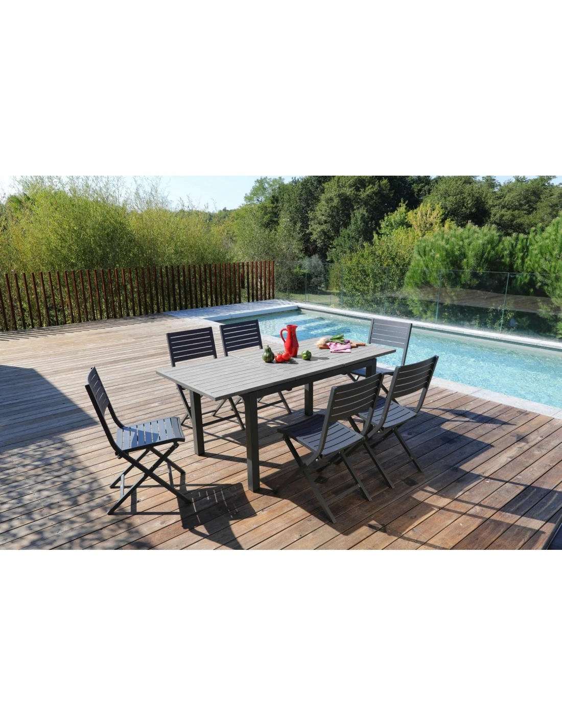 Table extensible Côme pour 6 à 8 personnes avec une allonge papillon, plateau à lattes en aluminium imitation bois et pieds coloris anthracite.